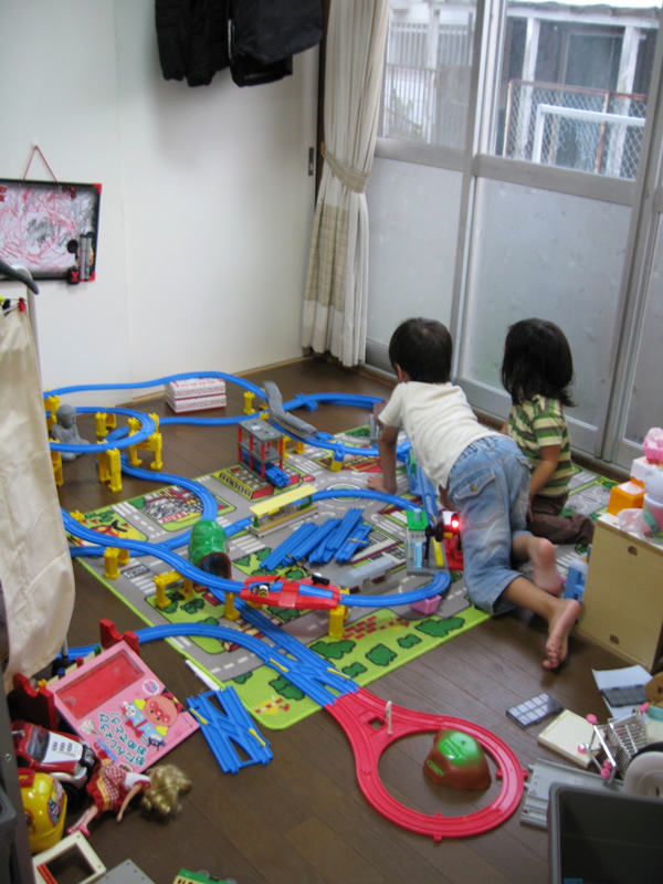 朝食の後はTAKUのキッズとプラレールで遊ぶ。プラレールとはプラスチックのレールをつなげて電車を走らせるおもちゃ。これが以外と面白くって夢中になって路線をつくってた。大人の妄想で壮大な路線をつくってたらレールが足りなくなってきたので横須賀のデパートまでプラレールを買いに出発。喜ぶキッズと30分くらいのドライブだけど俺は車のなかで睡眠。両手一杯にプラレールと新車両を大人買いして家にもどる。おっさん2人で汗をかきながら真剣にプラレールを制作開始。キッズも若干引くくらいマジになってたな。。。