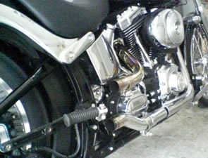 モーターステージのブラスマフラーを購入。ダイナには高音でやかましーバンス&ハインズをつけているのでデュースには低音でハーレーっぽいマフラーを付け たかった。デュースのショットガンマフラーが気に入ってるから形はこのままで、しかも車検のとき面倒な思いをしたのでスリップオンのブラスマフラーを選 択。ノーマルマフラーは中間地点で連結されているので取り外しにはちょっこし力技が必要だったけどなんとか30分程度で取り外せた。